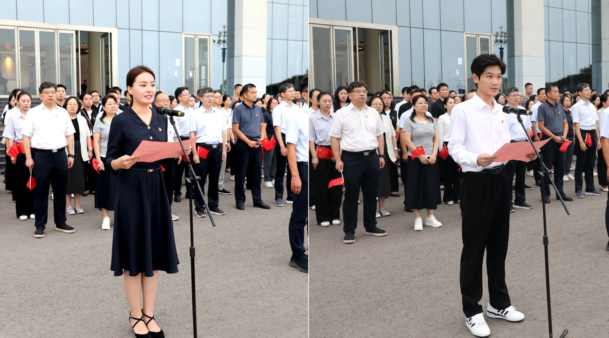 教师代表乔一迪、学生代表王浩杰分别作国旗下的主题演讲。全体师生共唱《我和我的祖国》表达对伟大祖国的深切热爱和美好祝福。